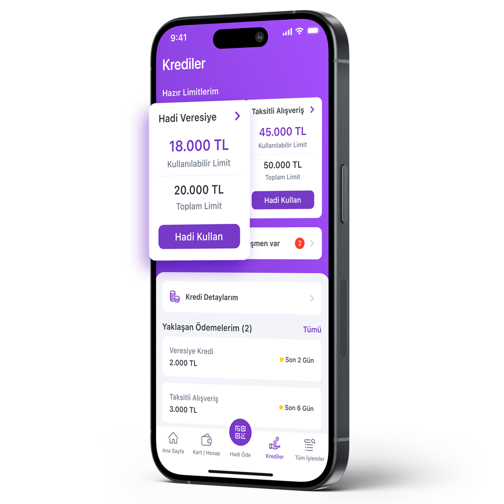 Hadi’de hesabının sınırlarını kendin belirleyebilirsin. İstediğin kadar para yükleyebilir, yüklediğin kadar harcayabilirsin. Ek masraflar olmadan hesabını yönetebilir, dilediğin kartla hesaplarını kontrol altında tutabilirsin.