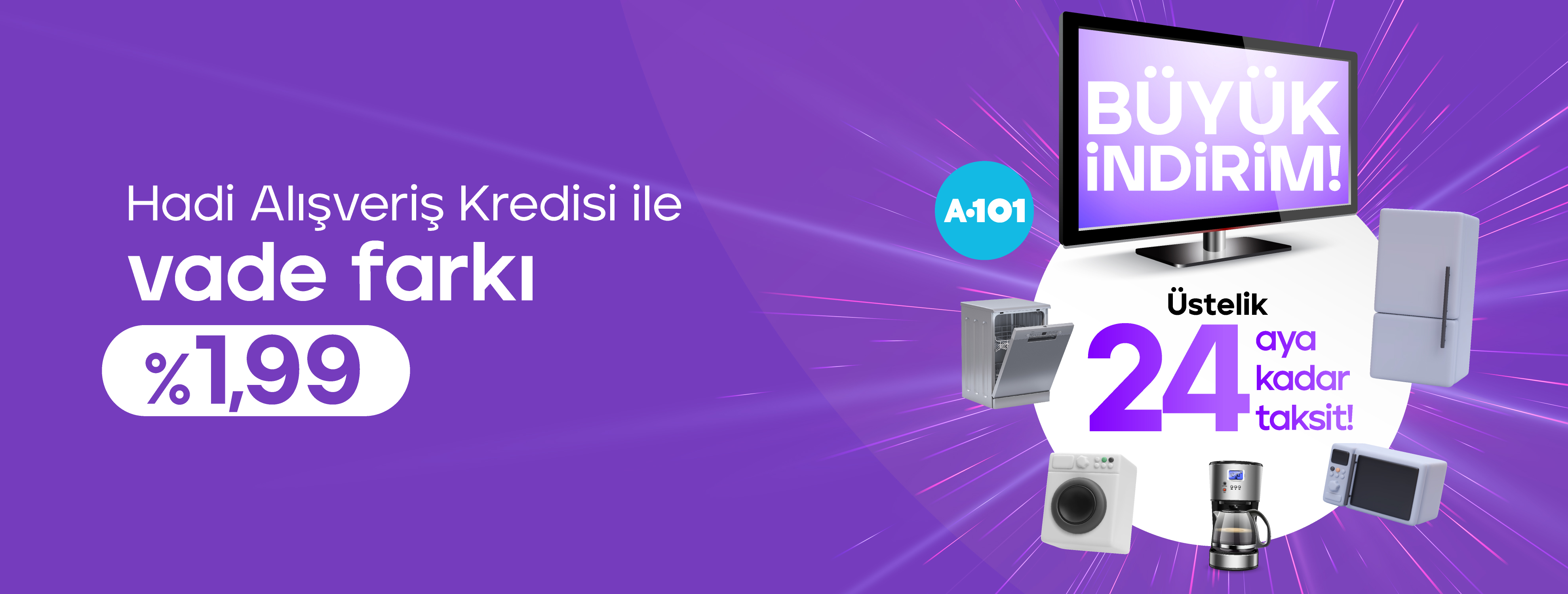 1 Kasım- 30 Kasım 2025 tarihleri arasında Hadi Alışveriş Kredisi ile A101 mağazalarından ve A101 Online kanallarında vade farkı %1,99!