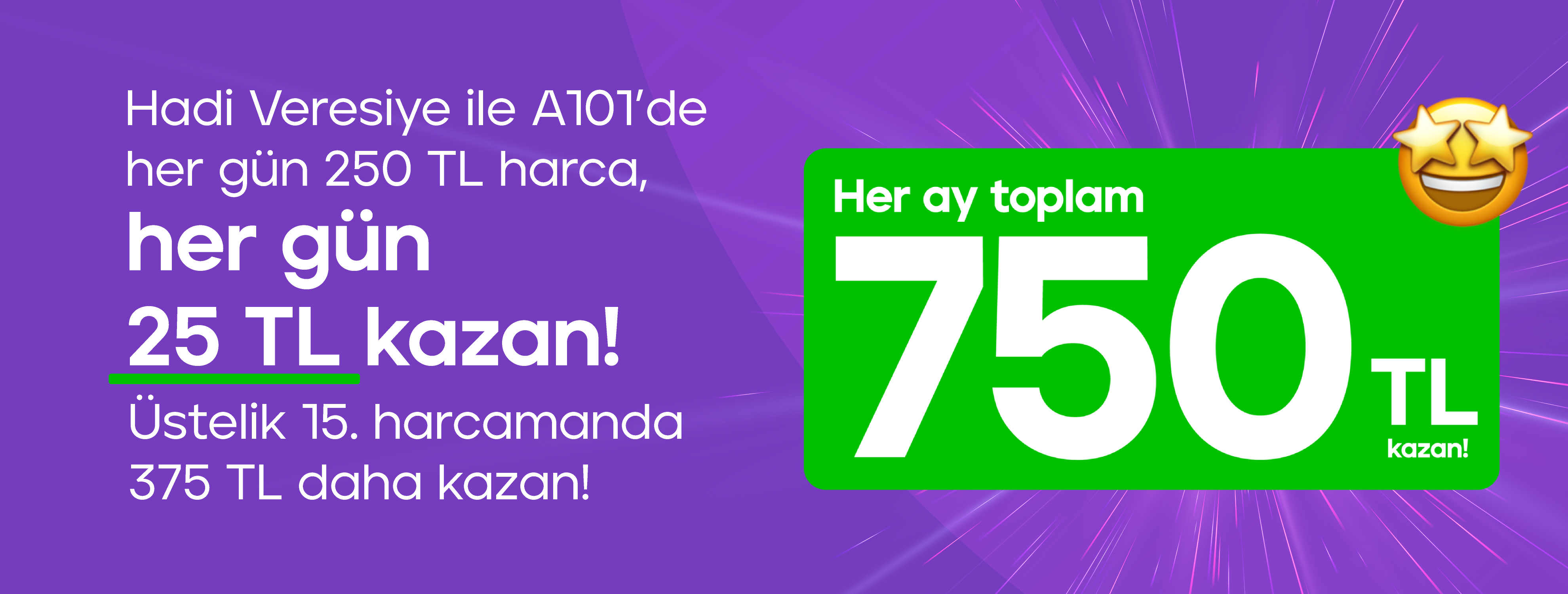 Hadi Veresiye ile A101’den 250 TL ve üzeri harcamana 25 TL, 15. harcamanda toplam 750 TL kazan!