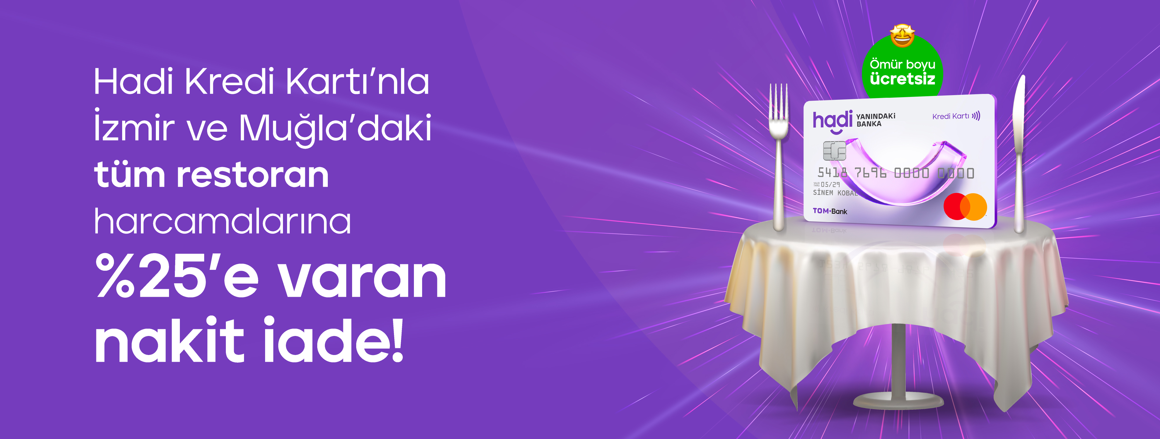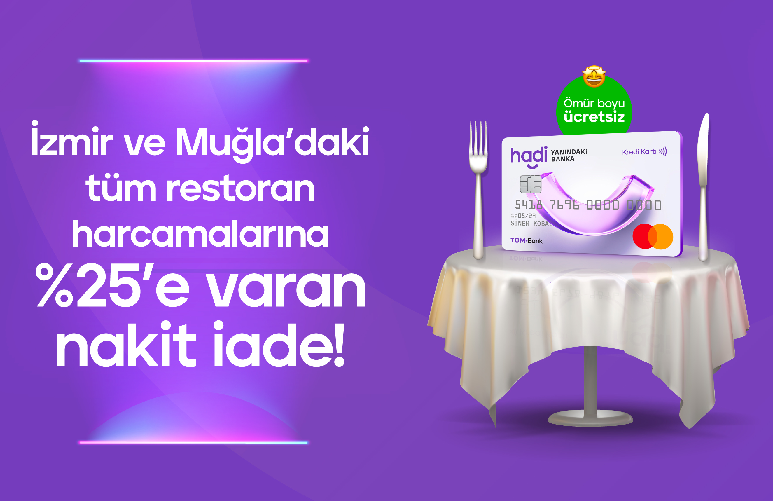 İzmir ve Muğla şehirlerinde Hadi Kredi Kartın ile yapacağın tüm restoran harcamalarında %25’e varan nakit iade ile ayda 1.500 TL’ye varan iade kazan!