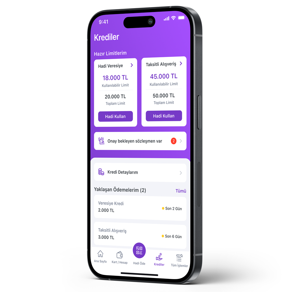 - Hadi Kredilerim ile kart limitin sana kalır, yaptığın alışveriş yüzünden kart limitin kapanmaz.