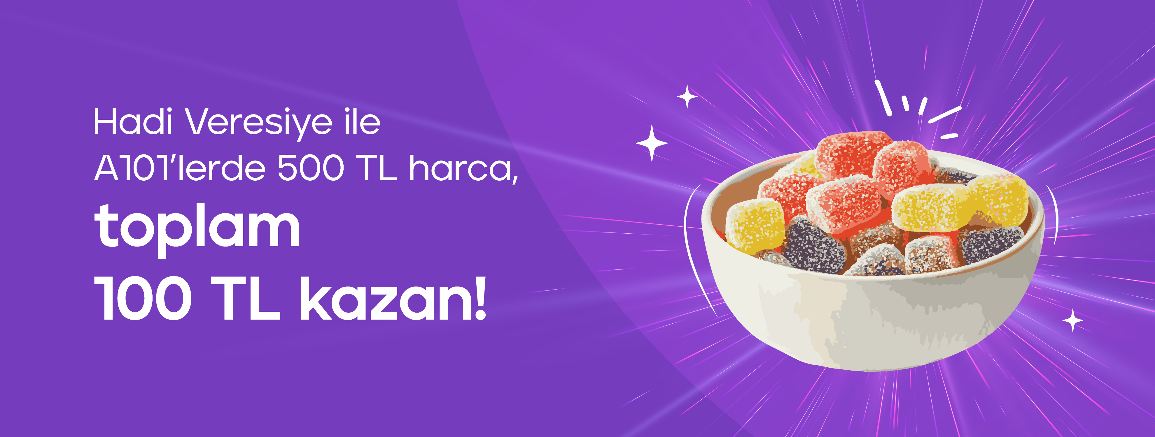 Hadi Veresiye ile A101’lerde tek seferlik 500 TL ve üzeri alışverişinde “Her Gün Kazandıran Veresiye Kampanyası” ödülü olan 25 TL’ye ek 75 TL, toplamda 100 TL kazan!
