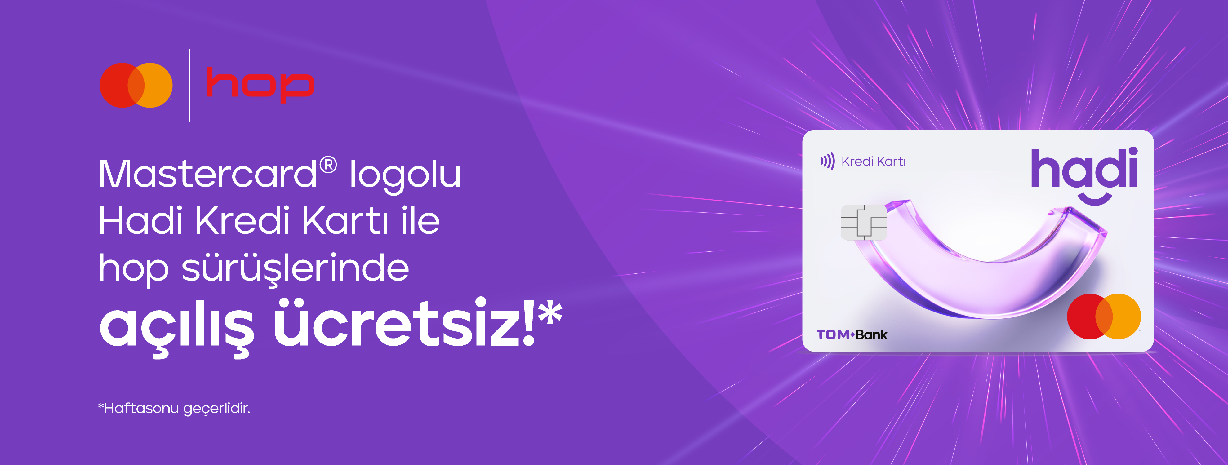 - 5 Ekim 2024 - 27 Ekim 2024 tarihleri arasında hop mobil uygulamasından Masterpass hesabına Mastercard logolu kredi kartı, banka kartı veya ön ödemeli kartını ekleyen kullanıcılar hafta sonları açılış ücreti ödemeden hop ile sürüşlerini gerçekleştirebilecektir.