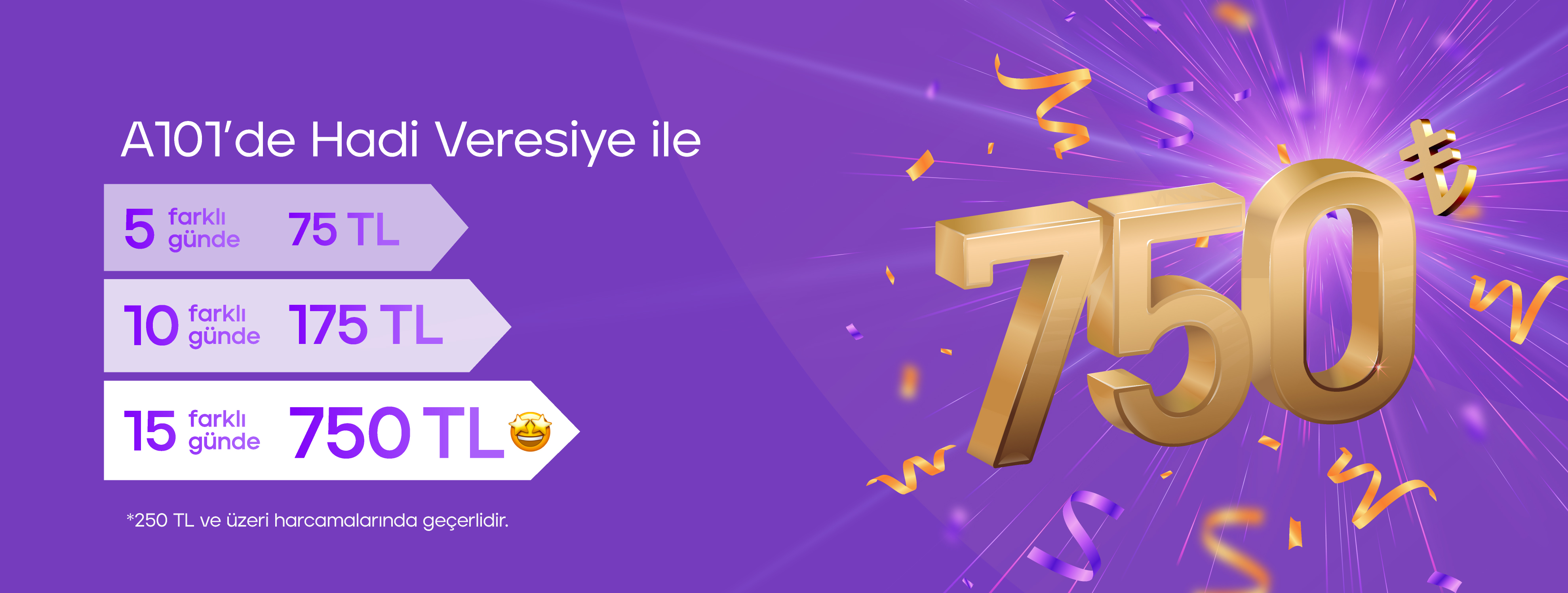 - Kampanya, 1 Mart-31 Mart tarihleri arasında A101.com.tr, A101 mobil uygulaması ve A101 mağazalarında Hadi Veresiye ile yapılan alışverişlerde geçerlidir.