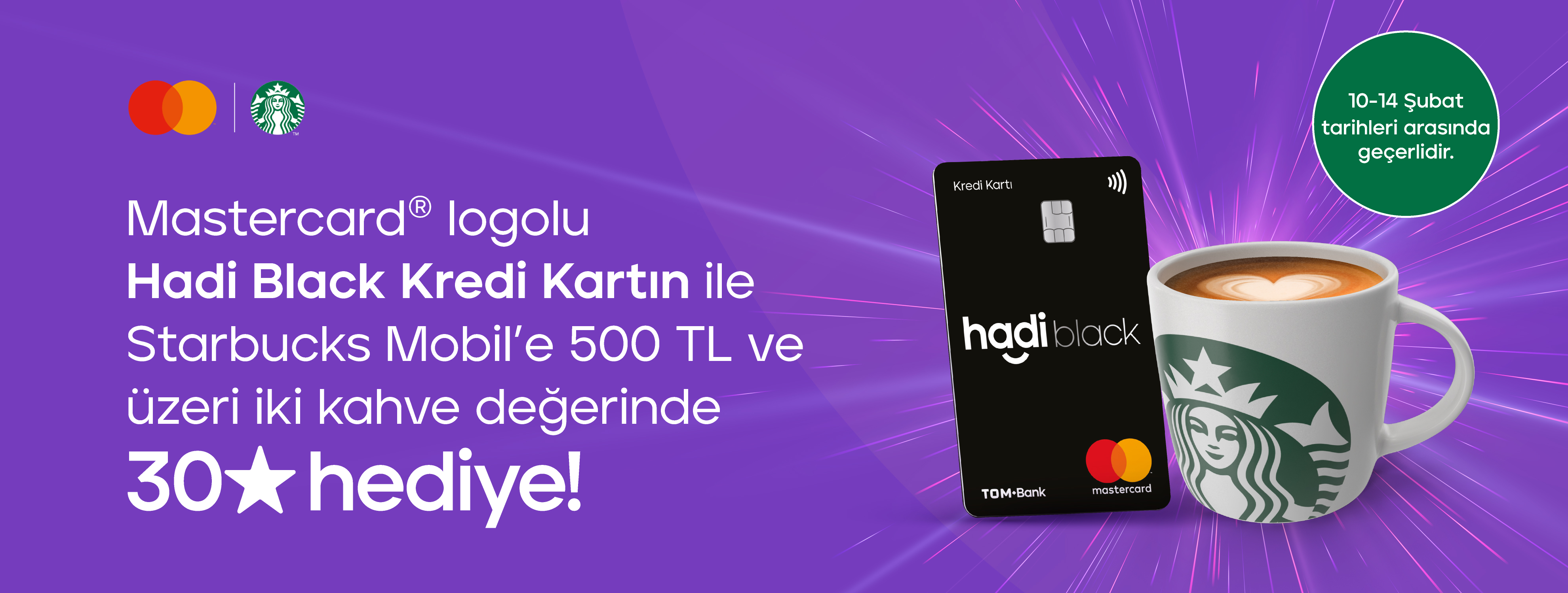 - Kampanya süresi boyunca Starbucks® Mobil Uygulaması üzerinden, Mastercard logolu Hadi Hesap Kartı ve Mastercard logolu Hadi Kredi Kartı ile yapılacak ilk 500 TL ve üzeri yüklemede 2 içecek değerinde 30 yıldız kazanımı olacaktır.
